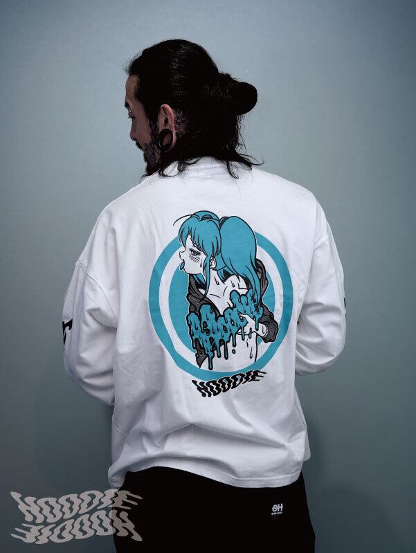 フロント、両袖にはHOODIEの代表的なウェーブロゴ、バックプリントはオールドスクールの【エロカワ】テーマのデザインになっています。